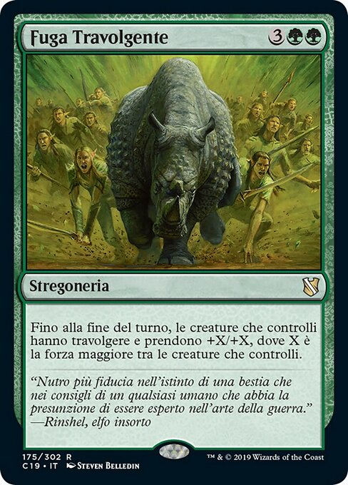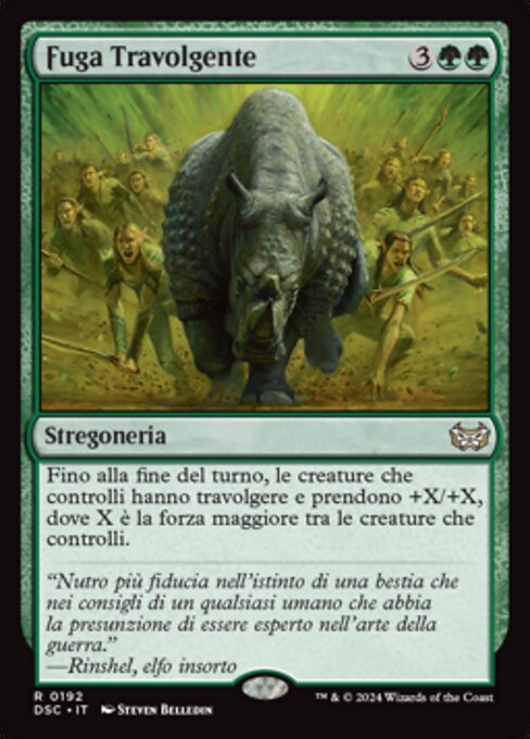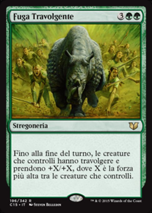 ![]() Variations— Parts— | Fuga TravolgenteFino alla fine del turno, le creature che controlli hanno travolgere e prendono +X/+X, dove X è la forza più alta tra le creature che controlli.