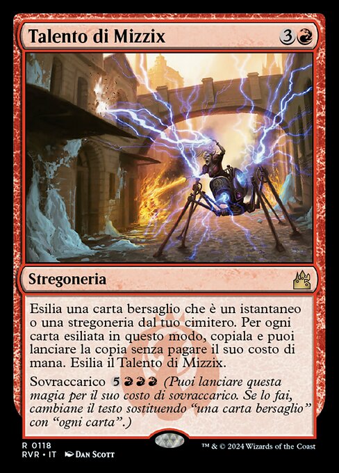 |  Variations— Parts— | Talento di MizzixEsilia una carta bersaglio che è un istantaneo o una stregoneria dal tuo cimitero. Per ogni carta esiliata in questo modo, copiala e puoi lanciare la copia senza pagare il suo costo di mana. Esilia il Talento di Mizzix.Sovraccarico