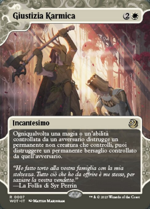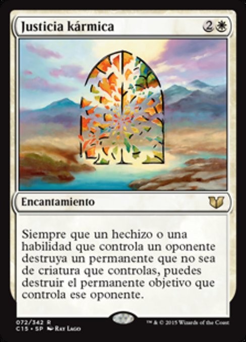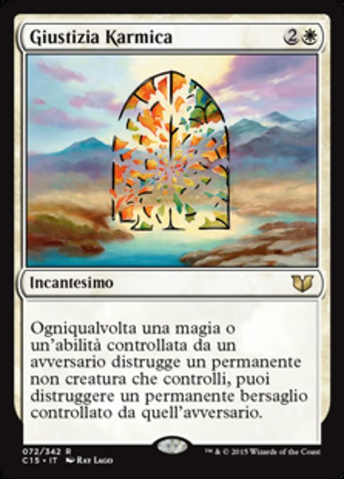 ![]() Variations— Parts— | Giustizia KarmicaOgniqualvolta una magia o un'abilità controllata da un avversario distrugge un permanente non creatura che controlli, puoi distruggere un permanente bersaglio controllato da quell'avversario.
