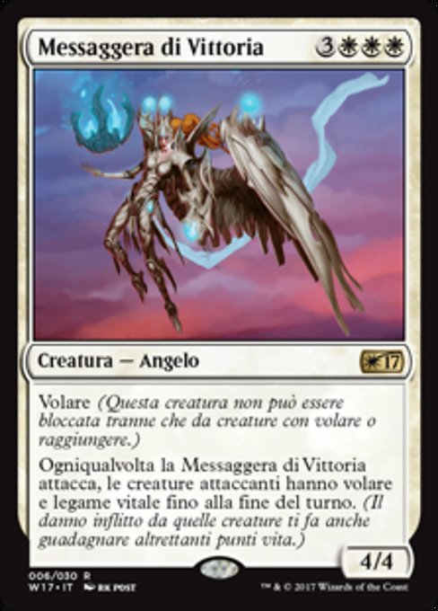 |  Variations— Parts— | Messaggera di Vittoria4 / 4 VolareOgniqualvolta la Messaggera di Vittoria attacca, le creature attaccanti hanno volare e legame vitale fino alla fine del turno.