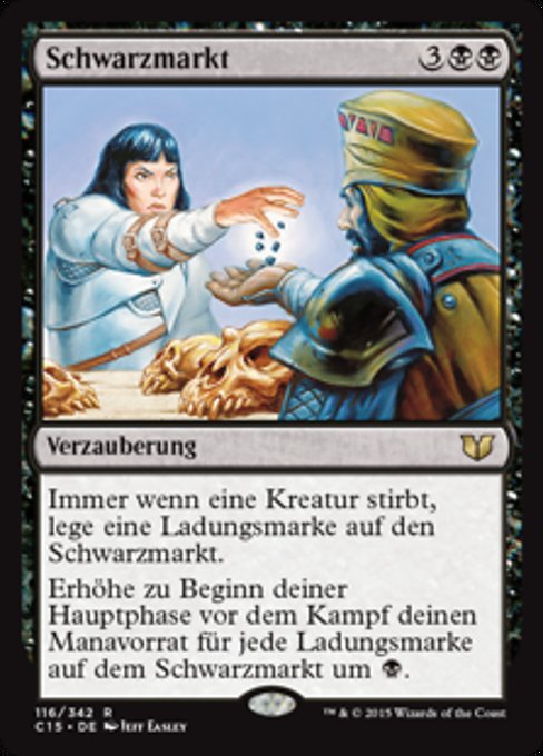 |  Variations— Parts— | 闇市場クリーチャーが1体死亡するたび、闇市場の上に蓄積カウンターを1個置く。あなたの戦闘前メイン・フェイズの開始時に、闇市場の上に置かれている蓄積カウンター1個につきあなたのマナ・プールに