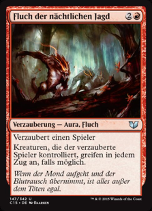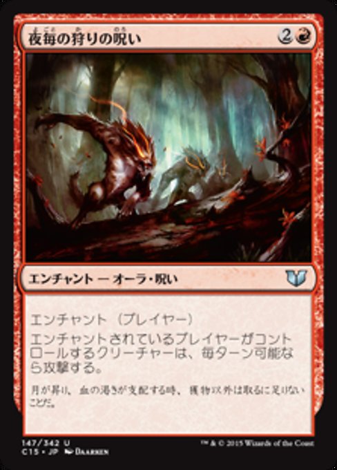 |  Variations— Parts— | 夜毎の狩りの呪いエンチャント(プレイヤー)エンチャントされているプレイヤーがコントロールするクリーチャーは、毎ターン可能なら攻撃する。