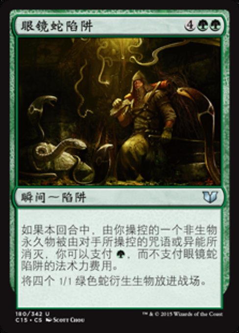 ![]() Variations— Parts— | コブラの罠あなたがコントロールするクリーチャーでないパーマネントが、このターンに対戦相手がコントロールする呪文や能力によって破壊されていたなら、あなたはコブラの罠のマナ・コストを支払うのではなく