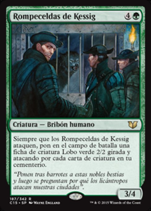 ![]() Variations— Parts— | ケッシグの檻破り3 / 4 ケッシグの檻破りが攻撃するたび、あなたの墓地にあるクリーチャー・カード1枚につき、緑の2/2の狼・クリーチャー・トークンを1体、タップ状態で攻撃している状態で戦場に出す。