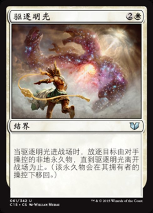 |  Variations— Parts— | 払拭の光払拭の光が戦場に出たとき、対戦相手がコントロールする土地でないパーマネント1つを対象とし、払拭の光が戦場を離れるまでそれを追放する。(そのパーマネントはオーナーのコントロール下で戦場に戻る。)