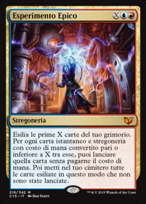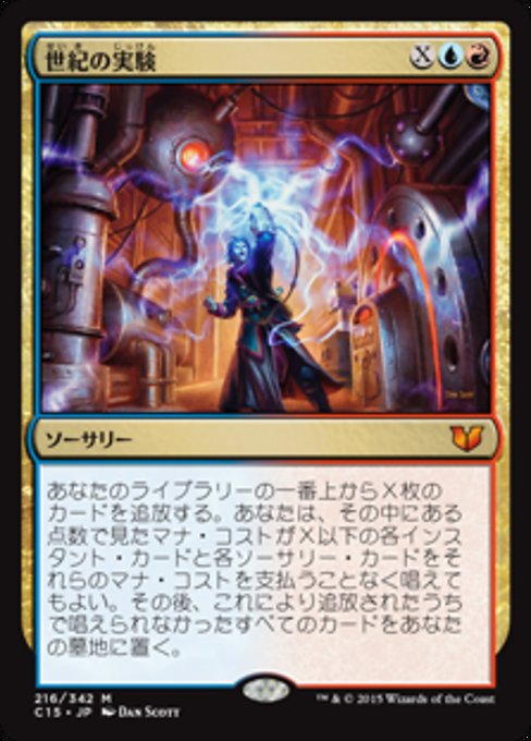 ![]() Variations— Parts— | 壮绝实验放逐你牌库顶的X张牌。对其中每张总法术力费用等于或小于X的瞬间与法术牌而言,你可以施放该牌且不需支付其法术力费用。然后将所有以此法放逐且未施放的牌置入你的坟墓场。