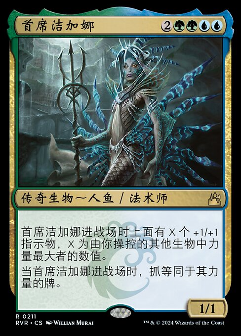 |  Variations— Parts— | 首席洁加娜1 / 1 首席洁加娜进战场时上面有X个+1/+1指示物,X为由你操控的其他生物中力量最大者的数值。当首席洁加娜进战场时,抓若干牌,其数量等同于它的力量。