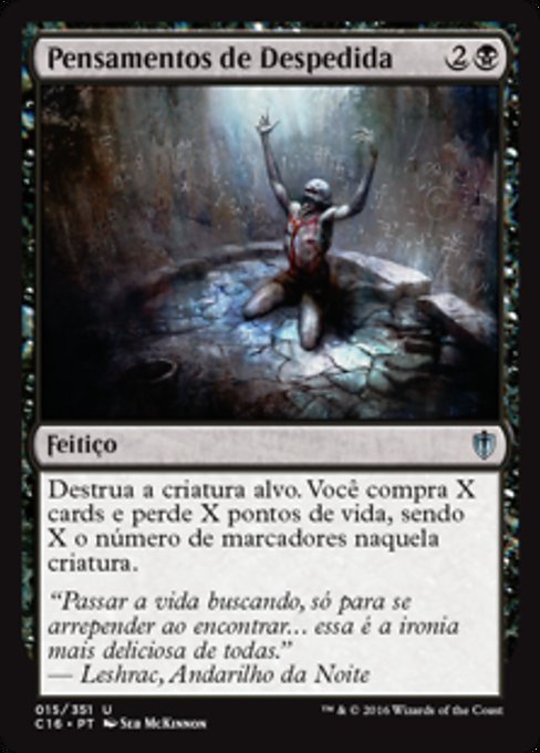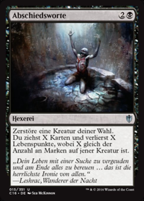 ![]() Variations— Parts— | Parting ThoughtsDestroy target creature. You draw X cards and you lose X life, where X is the number of counters on that creature.