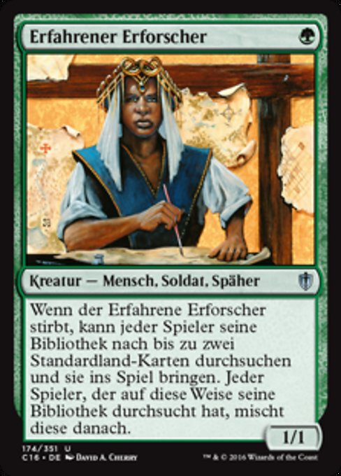 ![]() Variations— Parts— | Explorador veterano1 / 1 Cuando el Explorador veterano muera, cada jugador puede buscar en su biblioteca hasta dos cartas de tierra básica y ponerlas en el campo de batalla. Luego cada jugador que buscó en su biblioteca de esta manera la baraja.