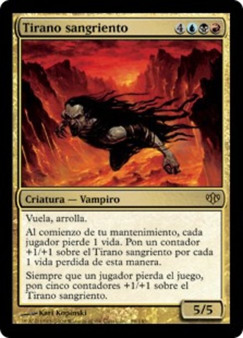 |  Variations— Parts— | Tirano sangriento5 / 5 Vuela, arrolla. Al comienzo de tu mantenimiento, cada jugador pierde 1 vida. Pon un contador +1/+1 sobre el Tirano sangriento por cada vida perdida de esta manera. Siempre que un jugador pierda el juego, pon cinco contadores +1/+1 sobre el Tirano sangriento.