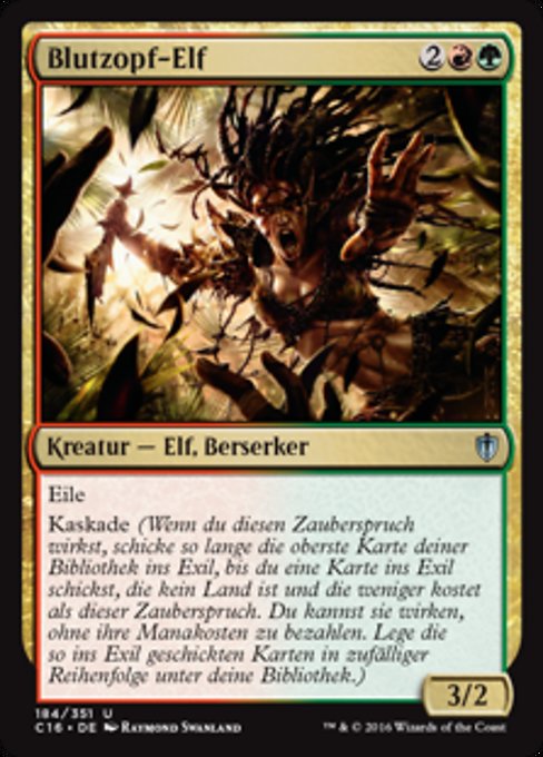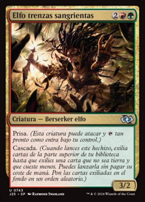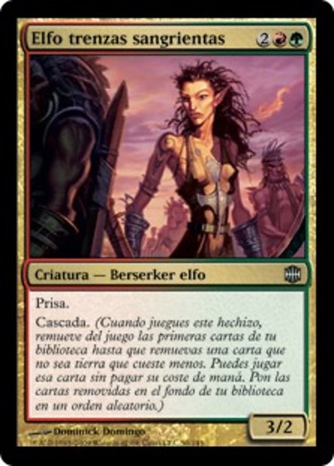 ![]() Variations— Parts— | Elfo trenzas sangrientas3 / 2 Prisa. Cascada. (Cuando lances este hechizo, exilia cartas de la parte superior de tu biblioteca hasta que exilies una carta que no sea tierra y que cueste menos. Puedes lanzarla sin pagar su coste de maná. Pon las cartas exiliadas en el fondo de tu biblioteca en un orden aleatorio.)