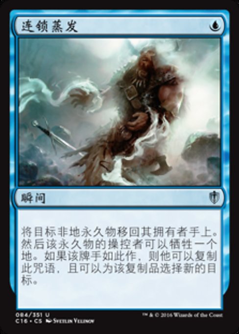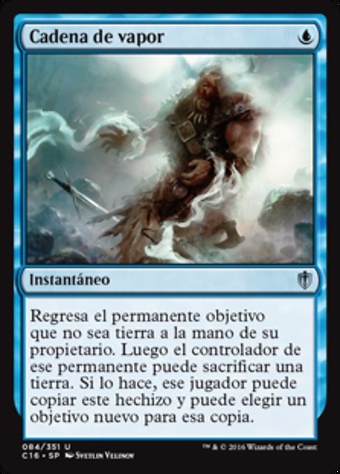 |  Variations— Parts— | Cadena de vaporRegresa el permanente objetivo que no sea tierra a la mano de su propietario. Luego el controlador de ese permanente puede sacrificar una tierra. Si lo hace, ese jugador puede copiar este hechizo y puede elegir un objetivo nuevo para esa copia.