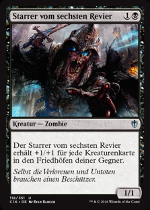 ![]() Variations— Parts— | Nécrophage de la Sixième circonscription1 / 1 Le Nécrophage de la Sixième circonscription gagne +1/+1 pour chaque carte de créature dans les cimetières de vos adversaires.