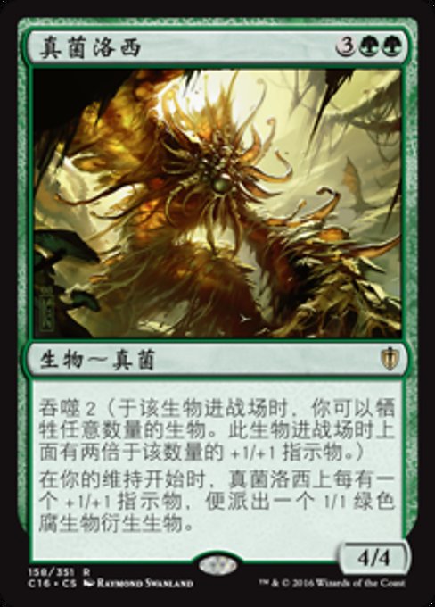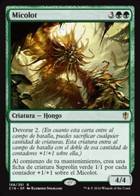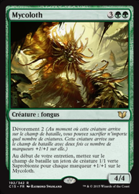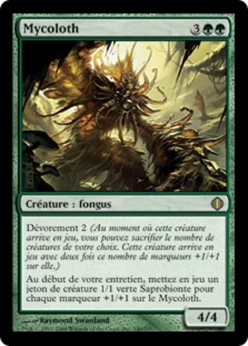 ![]() Variations— Parts— | Mycoloth4 / 4 Dévorement 2 (Au moment où cette créature arrive sur le champ de bataille, vous pouvez sacrifier n'importe quel nombre de créatures. Cette créature arrive sur le champ de bataille avec deux fois ce nombre de marqueurs +1/+1 sur elle.) Au début de votre entretien, créez un jeton de créature 1/1 verte Saprobionte pour chaque marqueur +1/+1 sur le Mycoloth.