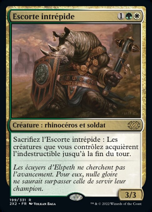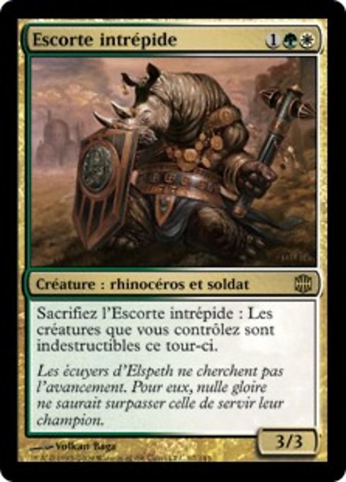 ![]() Variations— Parts— | Escorte intrépide3 / 3 Sacrifiez l'Escorte intrépide : Les créatures que vous contrôlez acquièrent l'indestructible jusqu'à la fin du tour.