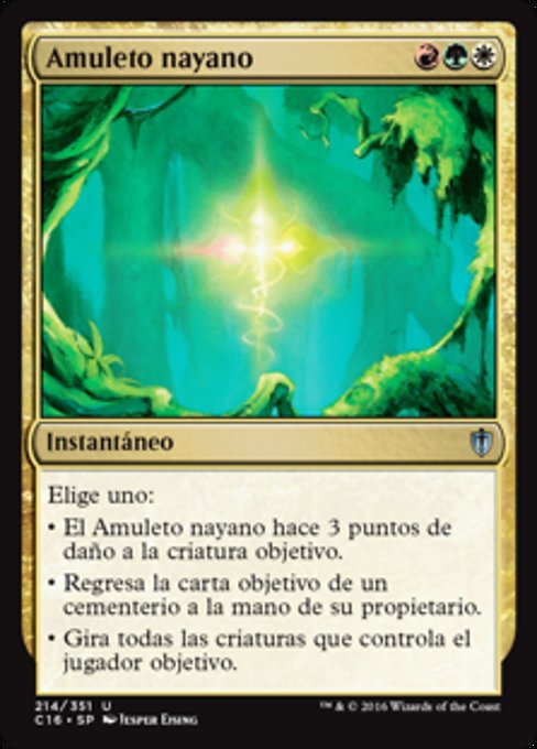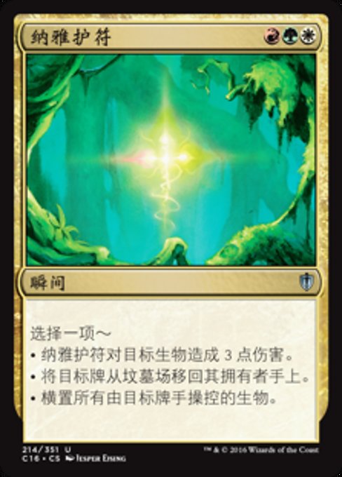 |  Variations— Parts— | Charme de NayaChoisissez l'un — • Le Charme de Naya inflige 3 blessures à une créature ciblée. • Renvoyez une carte ciblée depuis un cimetière dans la main de son propriétaire. • Engagez toutes les créatures que le joueur ciblé contrôle.