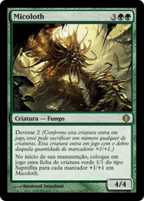 |  Variations— Parts— | Micoloth4 / 4 Devorar 2 (Conforme esta criatura entra no campo de batalha, você pode sacrificar um número qualquer de criaturas. Esta criatura entra no campo de batalha com o dobro daquela quantidade de marcadores +1/+1.) No início de sua manutenção, crie uma ficha de criatura verde 1/1 do tipo Saprófita para cada marcador +1/+1 em Micoloth.