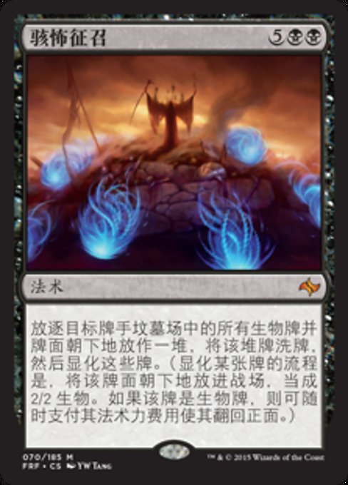 ![]() Variations— Parts— | 骇怖征召放逐目标牌手坟墓场中的所有生物牌并牌面朝下地放作一堆,将该堆牌洗牌,然后显化这些牌。(显化某张牌的流程是,将该牌面朝下地放进战场,当成2/2生物。如果该牌是生物牌,则可随时支付其法术力费用使其翻回正面。)