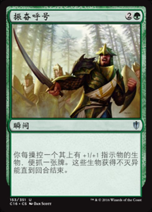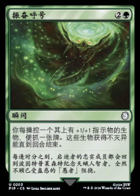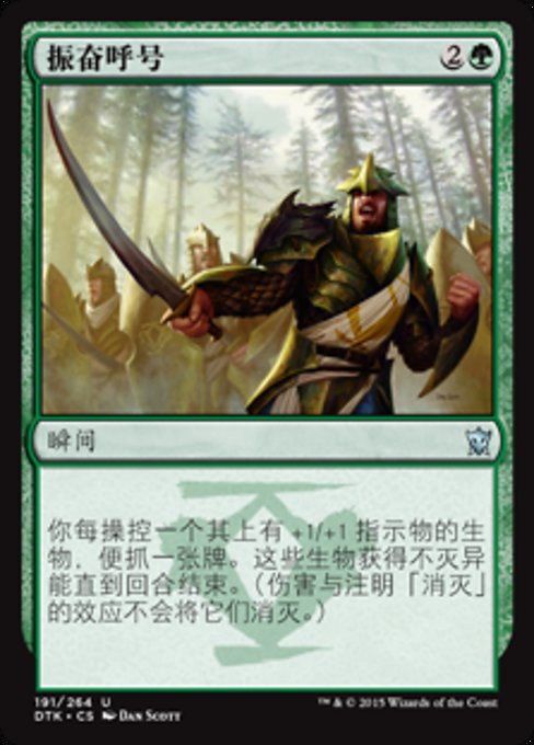 |  Variations— Parts— | 振奋呼号你每操控一个其上有+1/+1指示物的生物,便抓一张牌。这些生物获得不灭异能直到回合结束。