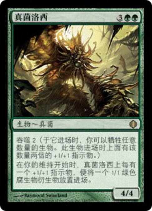|  Variations— Parts— | 真菌洛西4 / 4 吞噬2(于该生物进战场时,你可以牺牲任意数量的生物。此生物进战场时上面有两倍于该数量的+1/+1指示物。) 在你的维持开始时,真菌洛西上每有一个+1/+1指示物,便派出一个1/1绿色腐生物衍生生物。