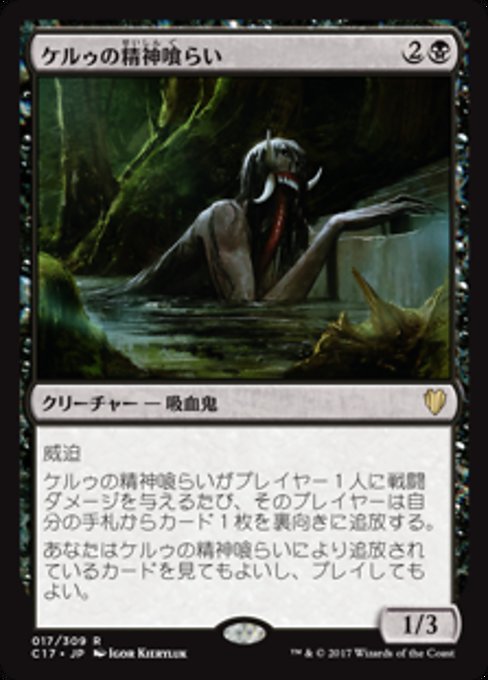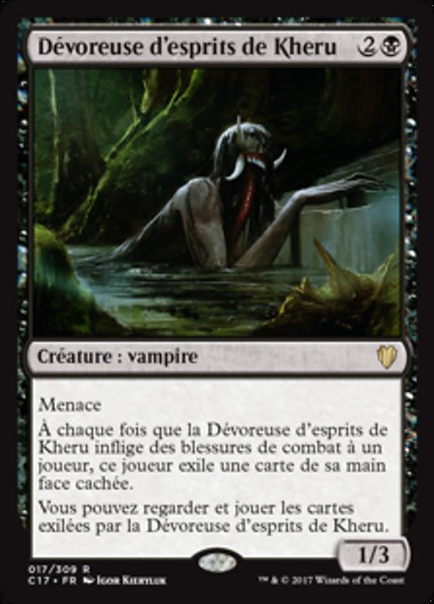 |  Variations— Parts— | Kheru Mind-Eater1 / 3 Menace Whenever this creature deals combat damage to a player, that player exiles a card from their hand face down. You may look at cards exiled with this creature, and you may play lands and cast spells from among those cards.