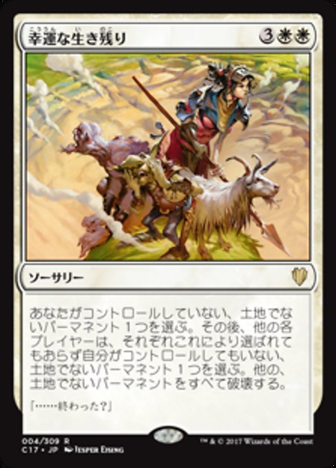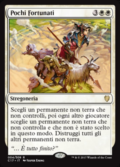 |  Variations— Parts— | Fortunate FewChoose a nonland permanent you don't control, then each other player chooses a nonland permanent they don't control that hasn't been chosen this way. Destroy all other nonland permanents.