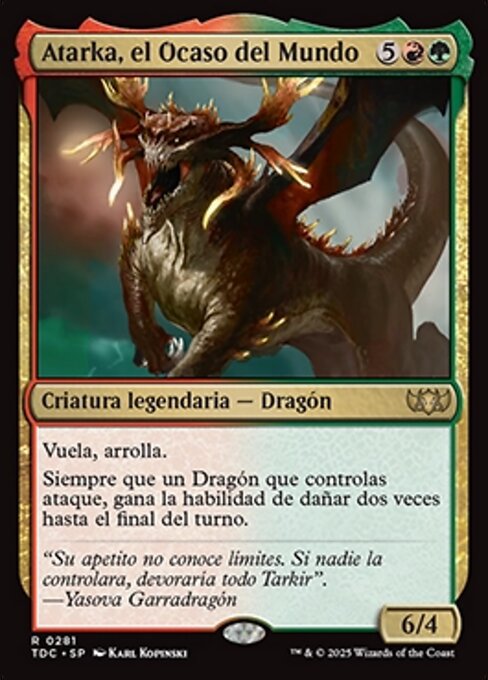 ![]() Variations— Parts— | Atarka, el Ocaso del Mundo6 / 4 Vuela, arrolla. Siempre que un Dragón que controlas ataque, gana la habilidad de dañar dos veces hasta el final del turno.