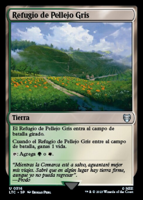 |  Variations— Parts— | Refugio de Pellejo GrisEl Refugio de Pellejo Gris entra al campo de batalla girado. Cuando el Refugio de Pellejo Gris entre al campo de batalla, ganas 1 vida.