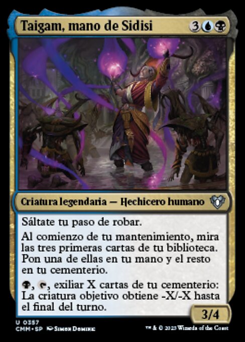 ![]() Variations— Parts— | Taigam, mano de Sidisi3 / 4 Sáltate tu paso de robar. Al comienzo de tu mantenimiento, mira las tres primeras cartas de tu biblioteca. Pon una de ellas en tu mano y el resto en tu cementerio.