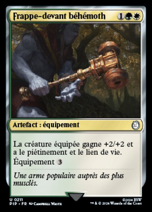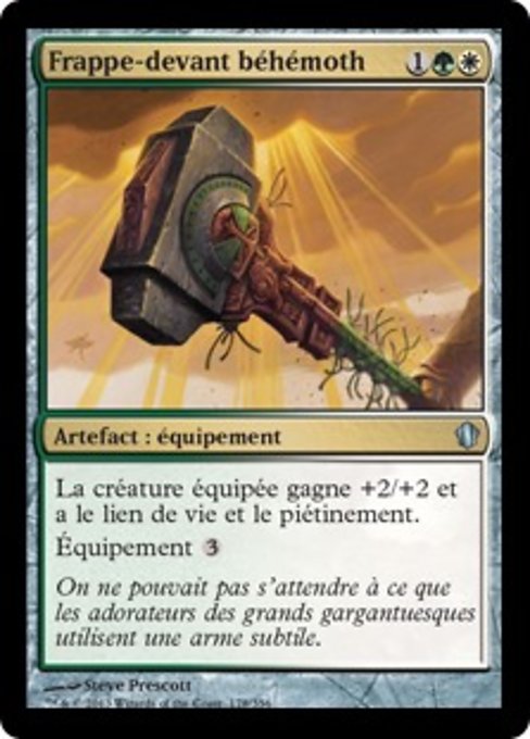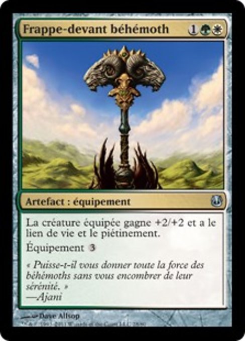|  Variations— Parts— | Frappe-devant béhémothLa créature équipée gagne +2/+2 et a le lien de vie et le piétinement. Équipement