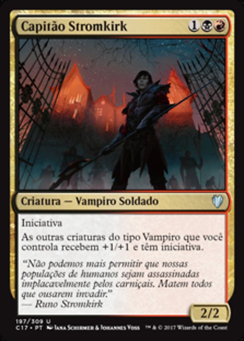 |  Variations— Parts— | Capitaine de Stromkirk2 / 2 Initiative Les autres créatures Vampire que vous contrôlez gagnent +1/+1 et ont l'initiative.