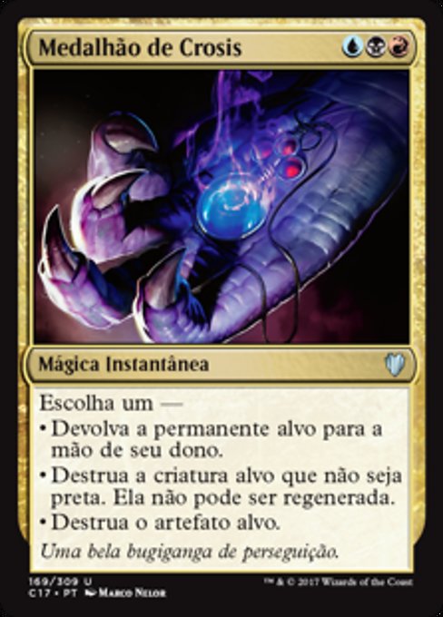 |  Variations— Parts— | Monile di CrosisScegli uno — • Fai tornare un permanente bersaglio in mano al suo proprietario. • Distruggi una creatura non nera bersaglio. Non può essere rigenerata. • Distruggi un artefatto bersaglio.