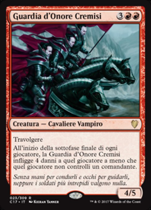 |  Variations— Parts— | Guardia d'Onore Cremisi4 / 5 Travolgere All'inizio della sottofase finale di ogni giocatore, la Guardia d'Onore Cremisi infligge 4 danni a quel giocatore a meno che quel giocatore non controlli un comandante.