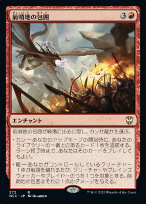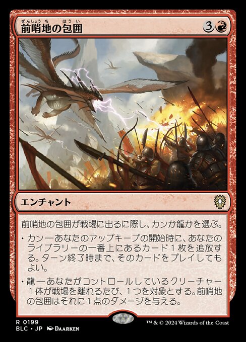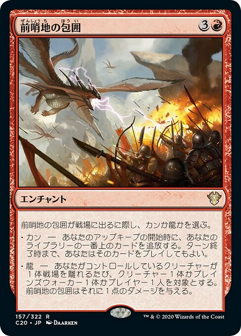 |  Variations— Parts— | 前哨地の包囲前哨地の包囲が戦場に出るに際し、カンか龍かを選ぶ。 • カン ― あなたのアップキープの開始時に、あなたのライブラリーの一番上のカードを追放する。ターン終了時まで、あなたはそのカードをプレイしてもよい。 • 龍 ― あなたがコントロールするクリーチャーが1体戦場を離れるたび、クリーチャー1体かプレイヤー1人を対象とする。前哨地の包囲はそれに1点のダメージを与える。