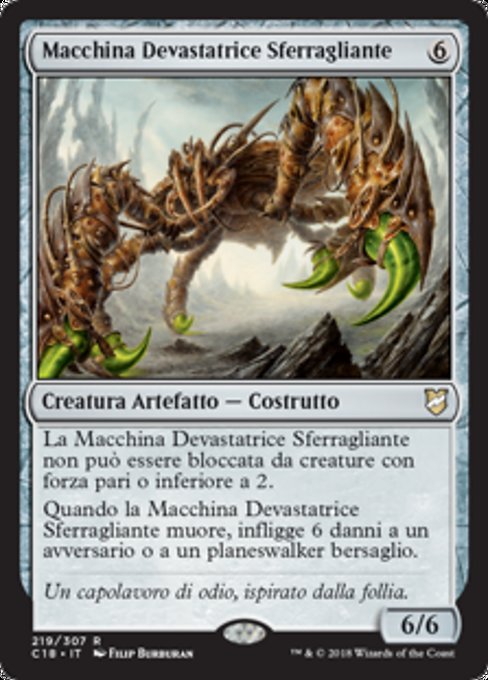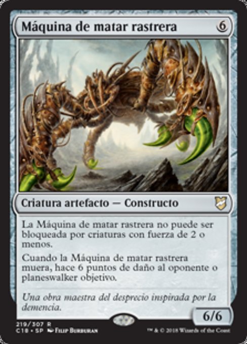 |  Variations— Parts— | Máquina de matar rastrera6 / 6 La Máquina de matar rastrera no puede ser bloqueada por criaturas con fuerza de 2 o menos. Cuando la Máquina de matar rastrera muera, hace 6 puntos de daño al oponente o planeswalker objetivo.