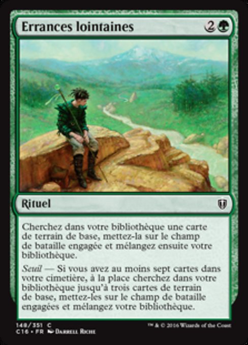 ![]() Variations— Parts— | Errances lointainesCherchez dans votre bibliothèque une carte de terrain de base, mettez-la sur le champ de bataille engagée et mélangez ensuite votre bibliothèque. Seuil — Si vous avez au moins sept cartes dans votre cimetière, à la place cherchez dans votre bibliothèque jusqu'à trois cartes de terrain de base, mettez-les sur le champ de bataille engagées et mélangez ensuite votre bibliothèque.
