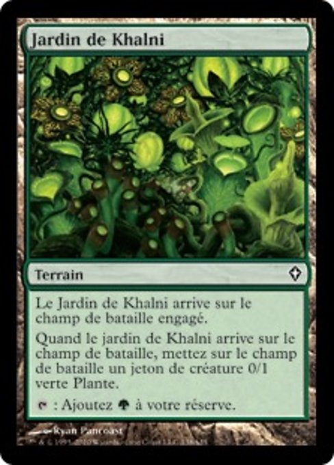 ![]() Variations— Parts— | Jardin de KhalniLe Jardin de Khalni arrive sur le champ de bataille engagé. Quand le Jardin de Khalni arrive sur le champ de bataille, créez un jeton de créature 0/1 verte Plante.