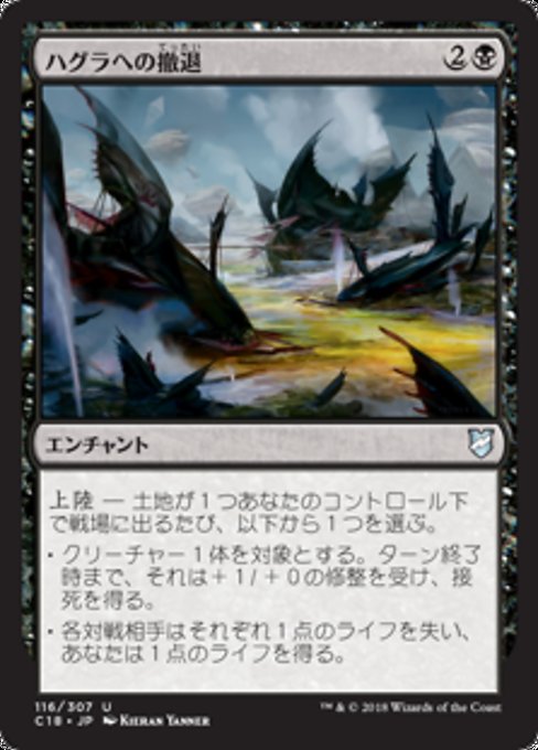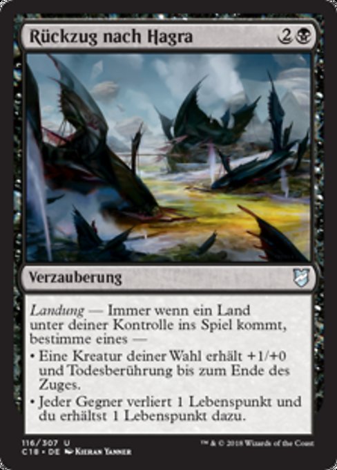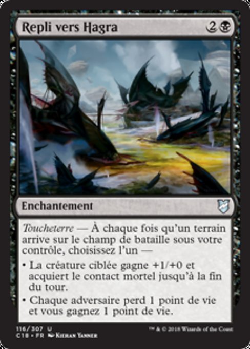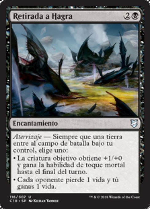 ![]() Variations— Parts— | Ritirata verso HagraTerraferma — Ogniqualvolta una terra entra nel campo di battaglia sotto il tuo controllo, scegli uno — • Una creatura bersaglio prende +1/+0 e ha tocco letale fino alla fine del turno. • Ogni avversario perde 1 punto vita e tu guadagni 1 punto vita.