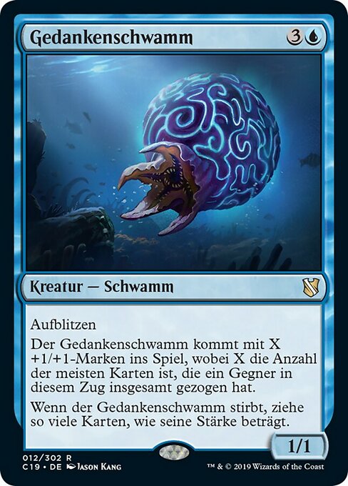 ![]() Variations— Parts— | Thought Sponge1 / 1 Flash This creature enters with a number of +1/+1 counters on it equal to the greatest number of cards an opponent has drawn this turn. When this creature dies, draw cards equal to its power.