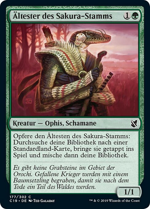 ![]() Variations— Parts— | Sakura-Tribe Elder1 / 1 Sacrifice this creature: Search your library for a basic land card, put that card onto the battlefield tapped, then shuffle.