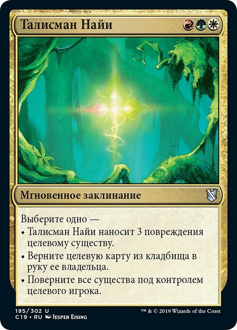 ![]() Variations— Parts— | Amuleto nayanoElige uno: • El Amuleto nayano hace 3 puntos de daño a la criatura objetivo. • Regresa la carta objetivo de un cementerio a la mano de su propietario. • Gira todas las criaturas que controla el jugador objetivo.