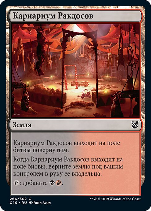 |  Variations— Parts— | Carnarium rakdosEl Carnarium rakdos entra al campo de batalla girado. Cuando el Carnarium rakdos entre al campo de batalla, regresa una tierra que controlas a la mano de su propietario.