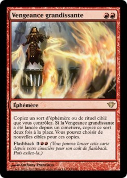 ![]() Variations— Parts— | Vengeance grandissanteCopiez un sort d'éphémère ou de rituel ciblé que vous contrôlez. Si ce sort a été lancé depuis un cimetière, copiez ce sort deux fois à la place. Vous pouvez choisir de nouvelles cibles pour ces copies. Flashback