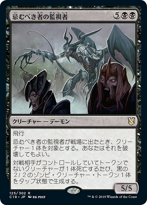 |  Variations— Parts— | Sorvegliante dei Dannati5 / 5 Volare Quando il Sorvegliante dei Dannati entra nel campo di battaglia, puoi distruggere una creatura bersaglio. Ogniqualvolta una creatura non pedina controllata da un avversario muore, crea una pedina creatura Zombie 2/2 nera TAPpata.