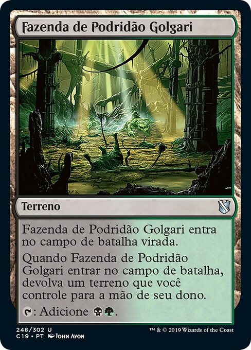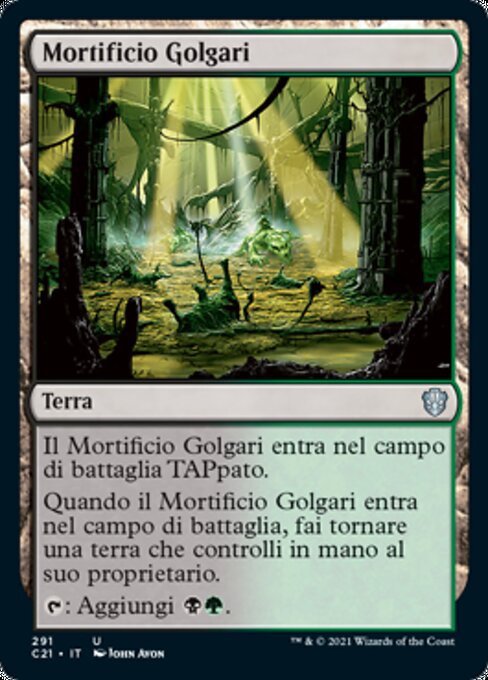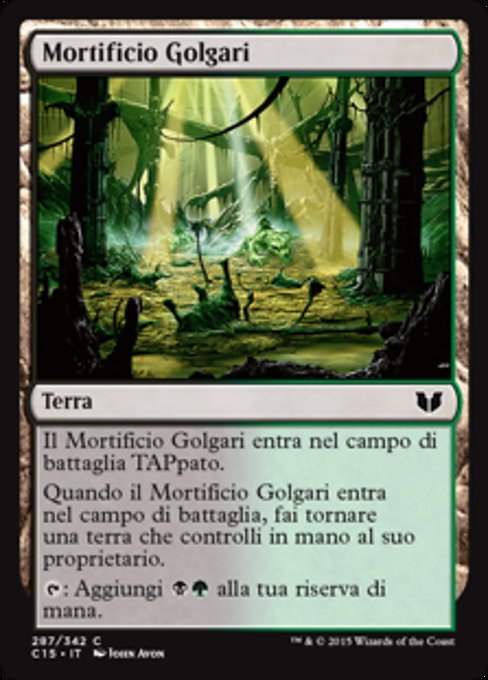 |  Variations— Parts— | Mortificio GolgariIl Mortificio Golgari entra nel campo di battaglia TAPpato. Quando il Mortificio Golgari entra nel campo di battaglia, fai tornare una terra che controlli in mano al suo proprietario.