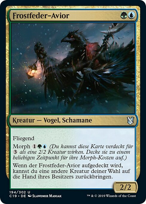 |  Variations— Parts— | 氷羽のエイヴン2 / 2 飛行 変異 氷羽のエイヴンが表向きになったとき、他のクリーチャー1体を対象とする。あなたはそれをオーナーの手札に戻してもよい。
