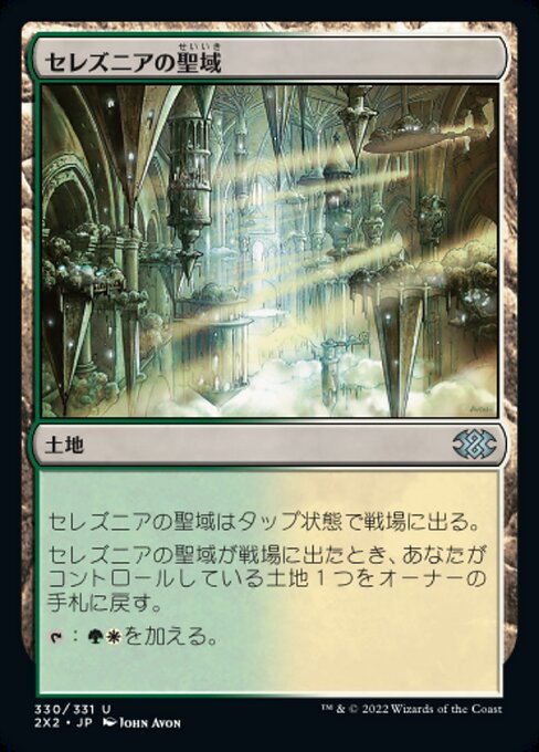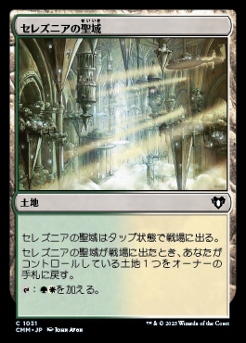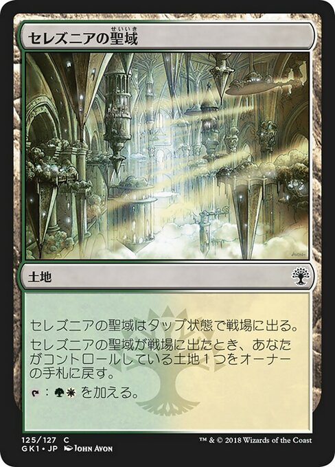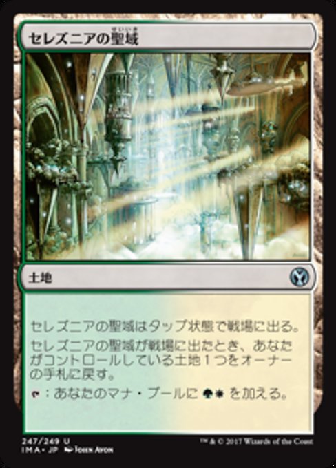 ![]() Variations— Parts— | セレズニアの聖域セレズニアの聖域はタップ状態で戦場に出る。 セレズニアの聖域が戦場に出たとき、あなたがコントロールしている土地1つをオーナーの手札に戻す。