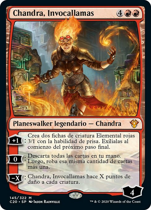 ![]() Variations— Parts— | Chandra die Flammenruferin+1 : Erzeuge zwei 3/1 rote Elementarwesen-Kreaturenspielsteine mit Eile. Schicke sie zu Beginn des nächsten Endsegments ins Exil. 0 : Wirf alle Karten aus deiner Hand ab und ziehe dann entsprechend viele Karten plus eine. −X : Chandra die Flammenruferin fügt jeder Kreatur X Schadenspunkte zu.
