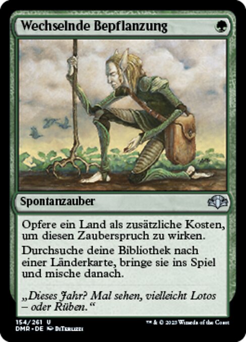 |  Variations— Parts— | Wechselnde BepflanzungOpfere ein Land als zusätzliche Kosten, um diesen Zauberspruch zu wirken. Durchsuche deine Bibliothek nach einer Länderkarte, bringe sie ins Spiel und mische dann deine Bibliothek.