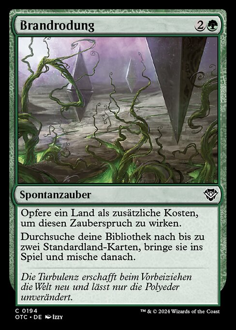 |  Variations— Parts— | BrandrodungOpfere ein Land als zusätzliche Kosten, um diesen Zauberspruch zu wirken. Durchsuche deine Bibliothek nach bis zu zwei Standardland-Karten, bringe sie ins Spiel und mische dann deine Bibliothek.